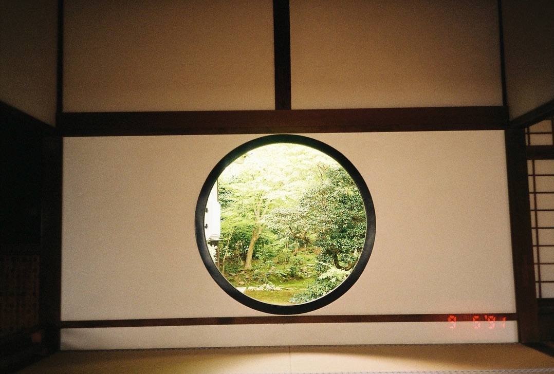 겐코안-금각사-료안지를 모두 둘러볼 생각으로 먼저 겐코안에 방문했다. 한적한 마을에 위치해 있어 사찰 내부가 무척 조용한데, 구석으로 가면 담장 너머에 있는 초등학교 운동장에서 아이들 뛰어 노는 소리가 들려 그곳에 앉아 있는 것도 괜찮다. 겐코안의 가장 유명한 2개의 창문은 내가 교토에서 본 건축 조형물 중 가장 아름답다. 원형 창문은 창문을 둘러싼 벽 전체가 완벽한 대칭을 이루고 있고, 창 바깥으로 녹음이 보이며, 바람이 약간 불어 나뭇가지가 조금씩 흔들린다. 그 앞에 가만히 앉아 명상했다. 몇 시간이고 그곳에 머물 수 있을 것 같았지만 숙소에서 멀리 나왔으므로 한 시간 정도 있다가 나왔다.