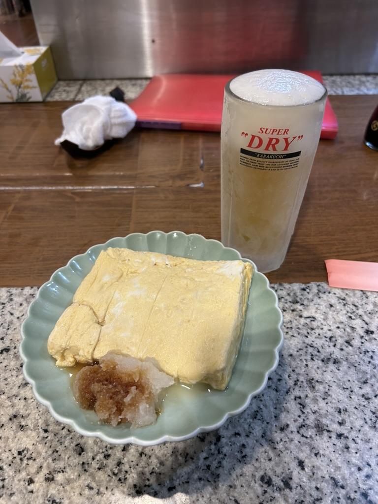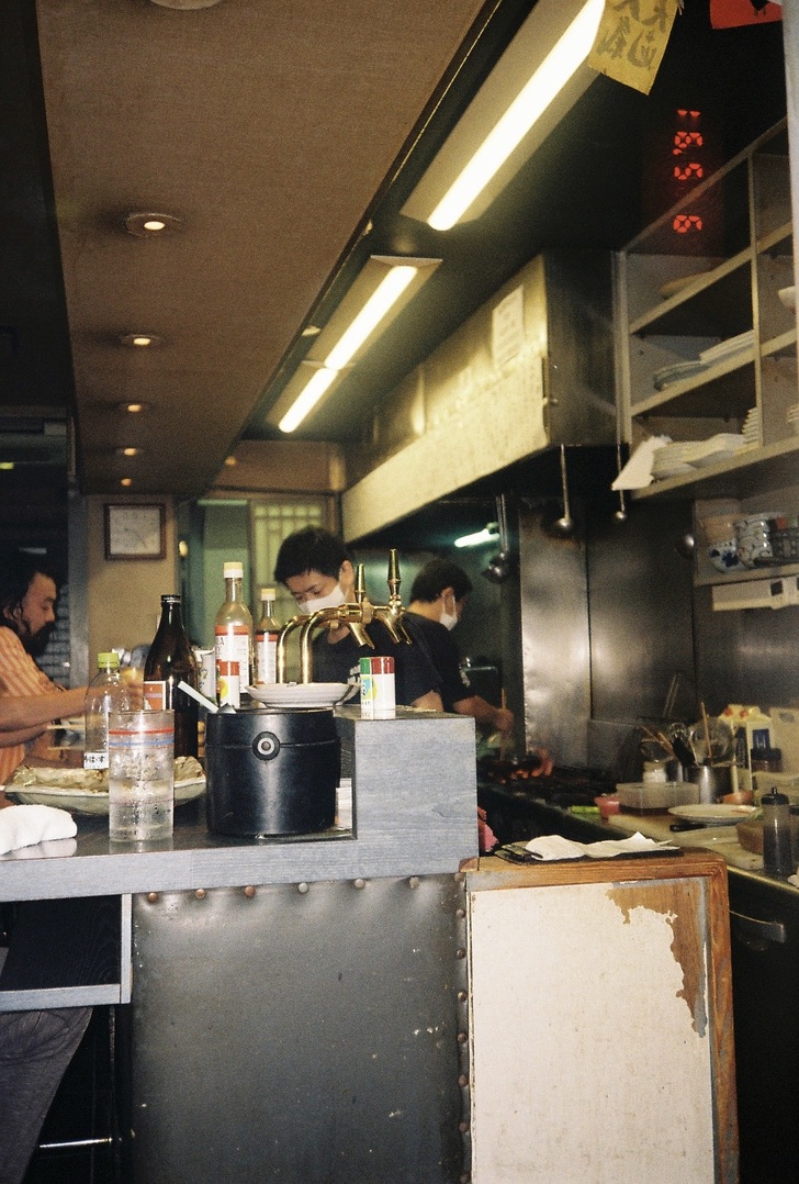 생맥주 한 잔, 감자 샐러드, 야끼소바를 주문했고 은색 기타 케이스를 멘 30대 남성 한 명이 들어온다. 내 옆에 자리를 내어주기 위해 이번엔 내가 한 칸 자리를 옮겼다. 내 감자 샐러드가 먼저 나오고, 그가 주문한 스지 간장 조림과 가라아게가 나왔다.