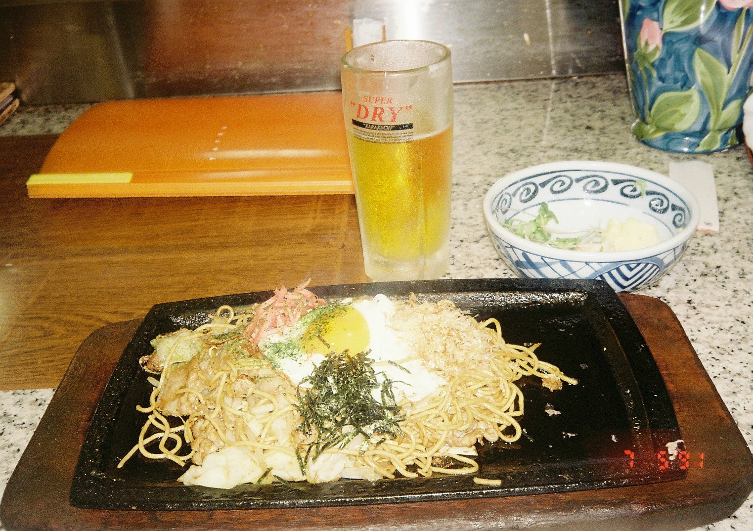 나에게 자리를 내어준 말 많은 아저씨가 쉴 새없이 떠들고, 주방의 마스터는 적절히 대꾸하고, 천장의 브라운관 티비에선 '쥬만지 2'가 동시통역되어 나온다. 그렇게 가만히 앉아 감자 샐러드를 먹고 맥주를 마시고 있으니 도저히 심심할 수가 없지. 야끼소바가 조금 느리게 조리되어 한참을 기다렸고 나는 맥주를 한 잔 더 시킨다.