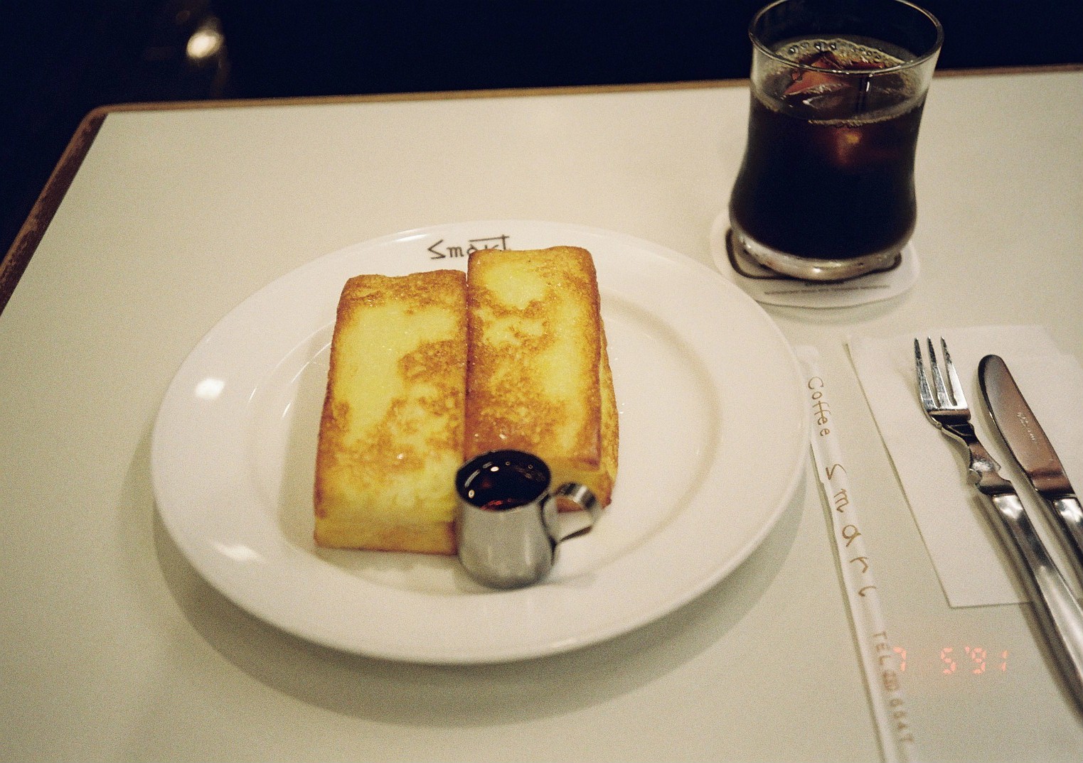 이곳은 타마고 산도와 프렌치 토스트로 유명하다. 프렌치 토스트와 드립 커피 아이스를 주문하고, 규쿄도에서 구매한 물건들을 천천히 살펴보았다. 커피는 아이스라 그런지 독특한 풍미가 느껴지진 않고, 프렌치 토스트는 겉만 바삭하게 구워 식감이 좋다. 나이프로 잘라 단면을 보니 빵의 안쪽은 달걀에 막 적셔진 그대로의 상태였다. 고온에 겉만 익힌 듯하다. 메이플시럽을 잔뜩 뿌려 아직 따끈한 프렌치 토스트를 와구와구 먹는다.