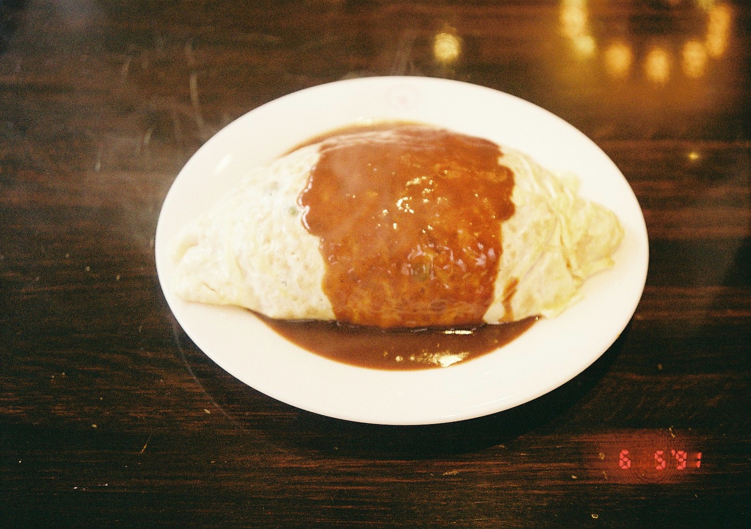 오무라이스는 소, 중, 대 세 가지 옵션이 있고 나는 중을 시켰는데 막상 받아보니 밥이 두 그릇 정도 들어간 것 같다. 숟가락으로 달걀 덮개를 잘라 밥과 함께 퍼먹는데, 김이 펄펄 나서 약간은 긴장한 상태였다. 그런데 볶음밥이 적당히 한숨 식어 있다. 손님이 편히 먹을 수 있도록 의도적으로 식힌 온도임에 틀림없다. 김은 메뉴가 내어지기 직전 뿌려진 소스에서 나온 것이다. 이 고집스러움이 '교토적인 것'인 걸까? 오무라이스의 맛은 한국에서 만드는 것과 유사하다. 밥은 케첩으로 볶고, 양파와 고기가 섞여 있다. 다른 테이블의 어린 학생이 시킨 오무라이스 대 사이즈를 보았는데 그 크기가 무지막지하다.