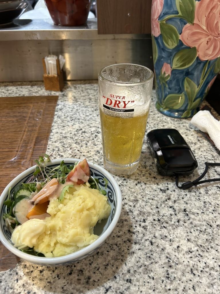 생맥주 한 잔, 감자 샐러드, 야끼소바를 주문했고 은색 기타 케이스를 멘 30대 남성 한 명이 들어온다. 내 옆에 자리를 내어주기 위해 이번엔 내가 한 칸 자리를 옮겼다. 내 감자 샐러드가 먼저 나오고, 그가 주문한 스지 간장 조림과 가라아게가 나왔다.