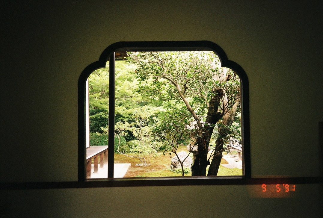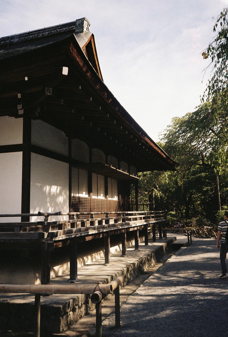겐코안-금각사-료안지를 모두 둘러볼 생각으로 먼저 겐코안에 방문했다. 한적한 마을에 위치해 있어 사찰 내부가 무척 조용한데, 구석으로 가면 담장 너머에 있는 초등학교 운동장에서 아이들 뛰어 노는 소리가 들려 그곳에 앉아 있는 것도 괜찮다. 겐코안의 가장 유명한 2개의 창문은 내가 교토에서 본 건축 조형물 중 가장 아름답다. 원형 창문은 창문을 둘러싼 벽 전체가 완벽한 대칭을 이루고 있고, 창 바깥으로 녹음이 보이며, 바람이 약간 불어 나뭇가지가 조금씩 흔들린다. 그 앞에 가만히 앉아 명상했다. 몇 시간이고 그곳에 머물 수 있을 것 같았지만 숙소에서 멀리 나왔으므로 한 시간 정도 있다가 나왔다.
