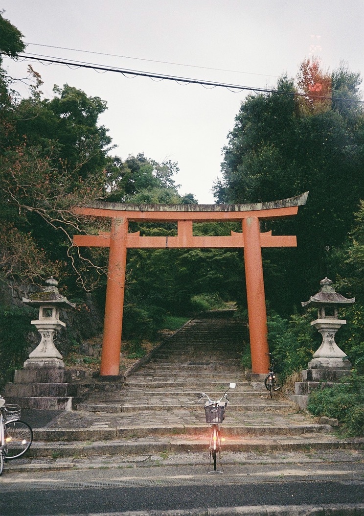 시게모리 미레이 정원 미술관을 보고 싶어 바로 앞까지 갔는데 자전거 댈 곳이 보이지 않아 알짱거리기만 한다. 열린 문 안으로는 인기척도 없고, 머리를 이리저리 굴리다 동쪽으로 300m 정도 떨어진 곳의 거대한 신사 입구 앞에 자전거가 서너 대 놓인 것을 발견했다. 그곳에 자전거를 대고, 내친김에 신사나 보고 올까 싶어 계단을 오르기 시작했다. 풀이 무성하고 길이 꺾여 있어 어디가 끝인지 보이지 않았는데, 서른 계단 쯤 오르니 사위가 몹시 을씨년스러워졌다. 날씨가 흐려 볕이 거의 들지 않는데 어딘가 멀리서 공포스러운 종소리가 들려오고, 철푸덕거리는 새의 날갯짓 소리나 풀을 헤집고 다니는 짐승 소리 같은 것이 반복되어 오싹한 느낌을 받았다. 계단을 계속 오르며, 귀국 후 한국 무당이 나를 보고 무시무시한 악귀가 씌였다고 호통치는 상상을 했는데 막상 오르니 작은 신사가 하나 있어 주변만 둘러보고 바로 내려왔다. 그새 원래 가려던 정원 미술관이 영업을 종료해 문이 굳게 닫혀 있었다.